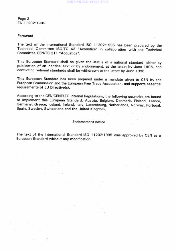 EN ISO 11202:1995 is a standard published by the European Committee for Standardization (CEN). Its full title is "Acoustics - Noise emitted by machinery and equipment - Measurement of emission sound pressure levels at a work station and at other specified positions - Survey method in situ (ISO 11202:1995)". This standard covers: The standard prescribes a method for measuring the emission sound pressure levels at work stations and other specified positions in the vicinity of different types of machinery and equipment. It prescribes requirements for the survey grade of accuracy on the test environment and instrumentation. The purpose of the measurements is to permit comparison of the performance of different units of a given family of machinery or equipment, under defined envionrmental conditions and standardized mounting and operating conditions.