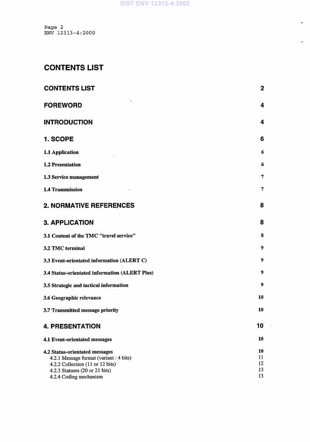 ENV 12313-4:2000 is a standardization document published by the European Committee for Standardization (CEN). Its full title is "Traffic and Traveller Information (TTI) - TTI Messages via Traffic Message Coding - Part 4: Coding Protocol for Radio Data System - Traffic Message Channel (RDS-TMC) - RDS-TMC using ALERT Plus with ALERT C". This standard covers: 1.1 Amplification: The ALERT Plus function is an extension of the ALERT C function. While ALERT C covers event-orientated information to be conveyed by the RDS medium, ALERT Plus deals with status-orientated information to be conveyed by the same medium. The ALERT Plus function informs motorists about the changes affecting the status of traffic at pre-defined locations.