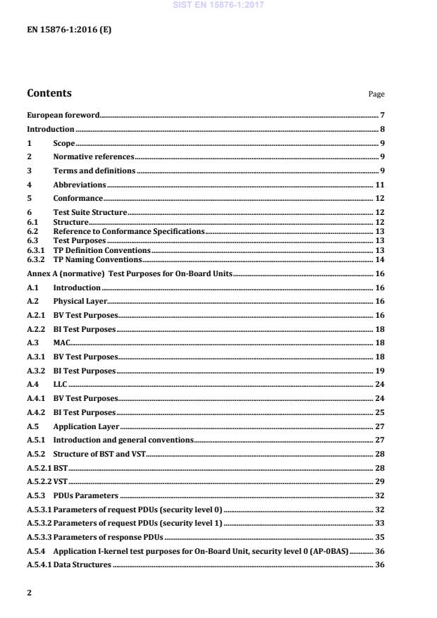 Test Purposes for On-Board Units . 16 A.1 Introduction . 16 A.2 Physical Layer . 16 A.2.1 BV Test Purposes . 16 A.2.2 BI Test Purposes . 18 A.3 MAC . 18 A.3.1 BV Test Purposes . 18 A.3.2 BI Test Purposes . 19 A.4 LLC . 24 A.4.1 BV Test Purposes . 24 A.4.2 BI Test Purposes . 25 A.5 Application Layer . 27 A.5.1 Introduction and general conventions . 27 A.5.2 Structure of BST and VST . 28 A.5.2.1 BST . 28 A.5.2.2 VST . 29 A.5.3 PDUs Parameters . 32 A.5.3.1 Parameters of request PDUs (security level 0) . 32 A.5.3.2 Parameters of request PDUs (security level 1) . 33 A.5.3.3 Parameters of response PDUs . 35 A.5.4 Application I-kernel test purposes for On-Board Unit, security level 0 (AP-0BAS) . 36 A.5.4.1 Data Structures . 36 SIST EN 15876-1:2017