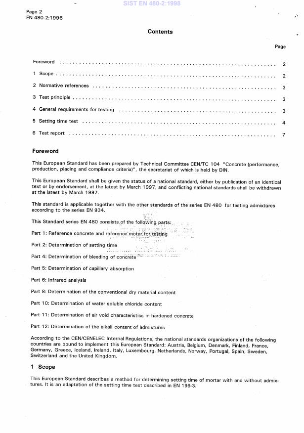 EN 480-2:1996 is a standard published by the European Committee for Standardization (CEN). Its full title is "Admixtures for concrete, mortar and grout - Test methods - Part 2: Determination of setting time". This standard covers: This European Standard describes a method for determining setting time of mortar with and without admixtures. It is an adaptation of the setting time test described in EN 196-3. This standard describes the reference method; it allows the use of alternative apparatus as indicated in notes provided that they do not effect the results.