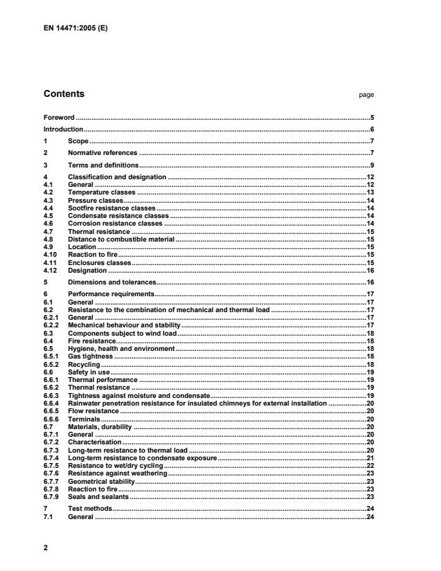 1 Scope This European Standard specifies the performance requirements and test methods for system chimneys with plastic flue liners used to convey the products of combustion from appliances to the outside atmosphere under dry and wet conditions. It also specifies the requirements for marking, manufacturer's instructions and evaluation of conformity. This European Standard describes chimney components from which system chimneys can be assembled. This European Standard is not applicable to chimneys with sootfire resistance classification class G. This European Standard is not applicable for chimneys with the following classification: corrosion resistance class 2 concerning natural wood ); corrosion resistance class 3; pressure class N2. This European Standard is applicable to chimneys constructed so that no condensate concentration can occur e.g. with a minimum inclination of 3 ° to the horizontal. This European Standard is only applicable to system chimneys with plastic flue liners and is not applicable for system chimneys with plastic coated flue liners. This European Standard is not applicable to structurally independent (free-standing or self-supporting) chimneys.