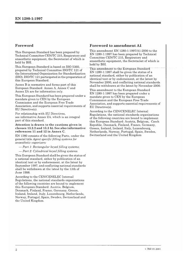 EN 1280-1:1997 is a standard published by the European Committee for Standardization (CEN). Its full title is "Agent specific filling systems for anaesthetic vaporizers - Part 1: Rectangular keyed filling systems". This standard covers: This Part of EN 1280 specifies requirements for agent-specific filling systems used with agent-specific anaesthetic vaporizers for anaesthetic agents excluding desflurane. NOTE 1: When used according to the instructions for use, the side effects or undesirable conditions of agent-specific filling systems constitute an acceptable risk when weighed against the performance. NOTE 2: Specifications for agent-specific filling systems for desflurane will be given in another part of EN 1280.