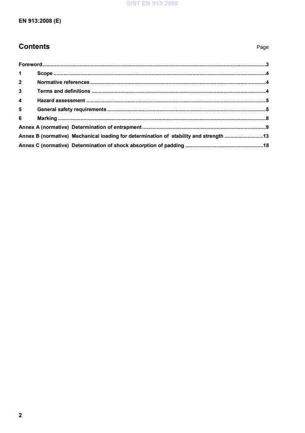 EN ISO 12100-1, Safety of machinery – Basic concepts, general principles for design – Part 1: Basic termi-nology, methodology (ISO 12100-1:2003) ISO 6487, Road vehicles – Measurement techniques in impact tests – Instrumentation 3 Terms and definitions For the purposes of this document, the following terms and definitions apply. 3.1 hazard source of possible injury or damage to health 3.2 body mass mass of the person(s) using the equipment 3.3 static load load acting on the equipment due to its structure, added weights and prestressed components 3.4 dynamic factor factor to take account of the increase in effective body mass during a dynamic movement 3.5 safety factor factor intended to cover uncertainties in the body loading and dynamic factor used, and which does not cover allowance for variations in materials and manufacturing processes SIST EN 913:2009