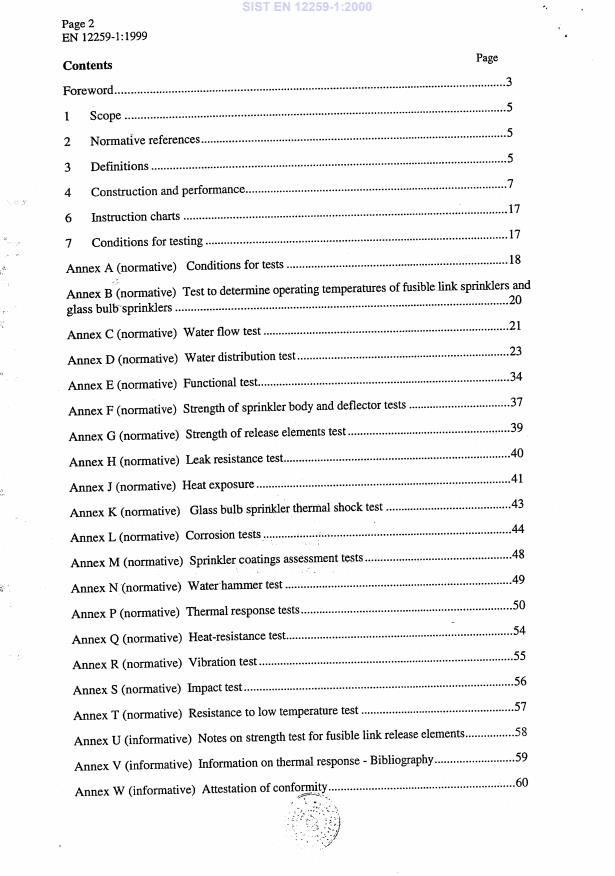 EN 12259-1:1999 is a standard published by the European Committee for Standardization (CEN). Its full title is "Fixed firefighting systems - Components for sprinkler and water spray systems - Part 1: Sprinklers". This standard covers: This part of EN 12259 specifies requirements for construction and performance of sprinklers which are operated by a change of state of an element or bursting of a glass bulb under the influence of heat, for use in automatic sprinkler systems conforming to. Test methods and a recommended test schedule for type approval testing are also given. Note: Alle pressure data in this European standard are given as gauge in bar ( bar= 100.000 Pa)