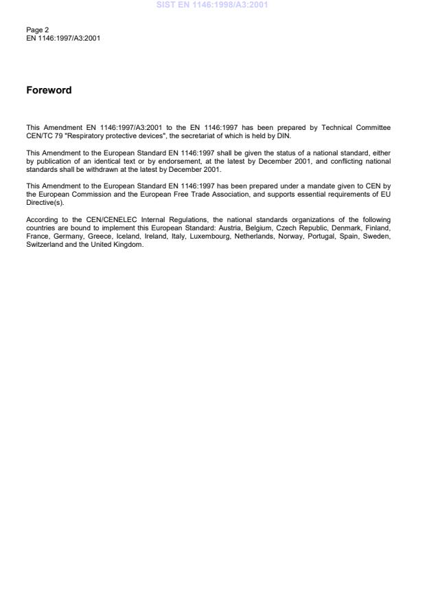 EN 1146:1997/A3:2001 is a amendment published by the European Committee for Standardization (CEN). Its full title is "Respiratory protective devices - Self-contained open-circuit compressed air breathing apparatus incorporating a hood (compressed air escape apparatus with hood) - Requirements, testing, marking". This standard covers: Migrated from Progress Sheet (TC Comment) (2000-07-10): UAP of 6 months (TC Res C 228/2000) (CC/000627)