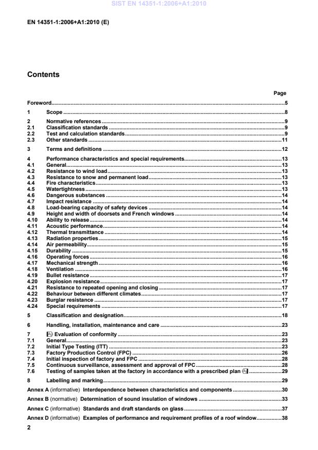 !Relationship between this European Standard and the Essential Requirements of EU Directive 2006/42/EC" . 70Bibliography . 71 Figures Figure 1 — Relationship between various standards .5Figure H.1 — Test specimen and SBI test rig . 48Figure J.1 — Attached bar(s) . 51Figure J.2 — Single cross bar in the IGU with or without attached bars . 52Figure J.3 — Multiple cross bars in the IGU with or without attached multiple bars . 52Figure J.4 — Glazing bar (Georgian bar) . 52Figure ZA.1 — Example CE marking information for roof window . 65Figure ZA.2 — Example CE marking information for external pedestrian doorset – Example 1 . 66Figure ZA.3 — Example of CE marking information for external pedestrian doorset – Example 2 . 67Tables Table 1 — Classification of characteristics for windows . 19Table 2 — Classification of characteristics for external pedestrian doorsets . 21Table A.1 — Interdependence between characteristics and components . 31Table B.1 — Rw for window based on Rw for IGU . 35Table B.2 — Rw + Ctr for window based on Rw + Ctr for IGU . 35Table B.3 — Extrapolation rules for different window sizes . 36SIST EN 14351-1:2006+A1:2010