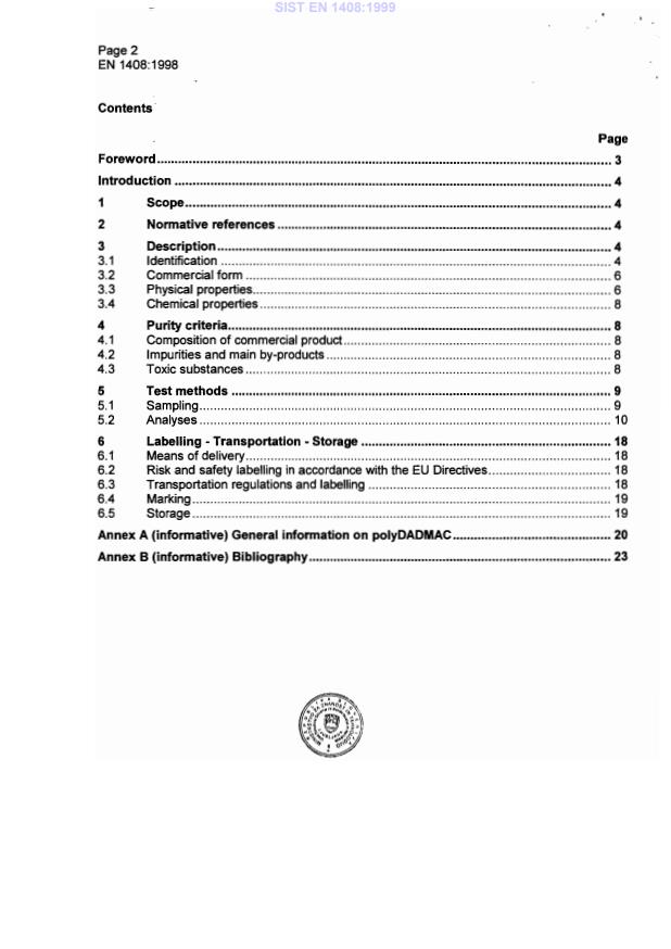 EN 1408:1998 is a standard published by the European Committee for Standardization (CEN). Its full title is "Chemicals used for treatment of water intended for human consumption - Poly (diallyldimethylammonium chloride)". This standard covers: This European standard is applicable to poly (diallyldimethylammonium chloride) used for treatment of water intended for human consumption. It describes the characteristics of poly (diallyldimethylammonium chloride) and specifies the requirements and the corresponding test methods for poly (diallyldimethylammonium chloride). Annex A gives some information on origin, use and handling of polyDADMAC. Annex B lists the bibliography.