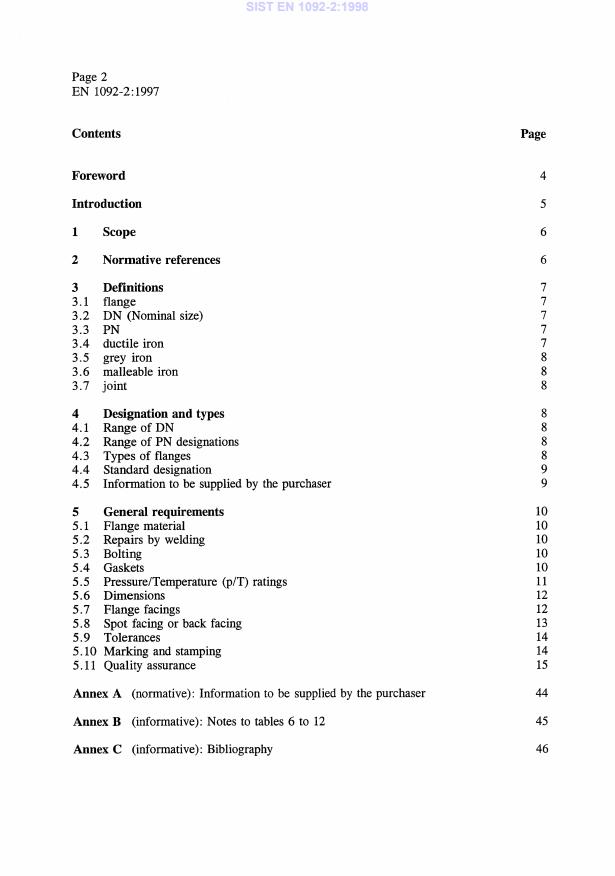 This part of EN 1092 specifies requirements for circular flanges made from ductile, grey and malleable cast iron for DN 10 to DN 4000 and PN 63. (See 4.1 and 4.2). This standard specifies the types of flanges and their facings, dimension and tolerances, bolt sizes, surface finish of jointing faces, marking testing, quality assurance and materials together with associated pressure/ temperature (p/T) ratings.
