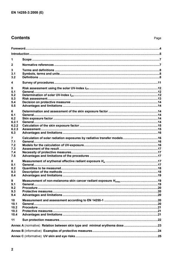 Risk assessment using the solar UV-Index (see Clause 5) Determination of the skin exposure factor (see Clause 6) Calculation of solar radiation exposures depending on geographical parameters (see Clause 7) Measurement of the erythemal effective exposure Her (see Clause 8) Measurement of the non-melanoma skin cancer radiant exposure Hnmsc (see Clause 9)