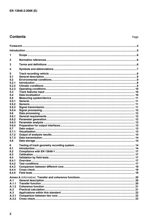 EN 13848-2:2006 is a standard published by the European Committee for Standardization (CEN). Its full title is "Railway applications - Track - Track geometry quality - Part 2: Measuring systems - Track recording vehicles". This standard covers: This European Standard specifies the minimum requirements for measuring principles and systems in order to produce comparable results. It applies to all measuring equipment fitted on dedicated recording vehicles, or on vehicles specifically modified for the same purpose, after the coming into force of the standard. It also defines the requirements of measurement.