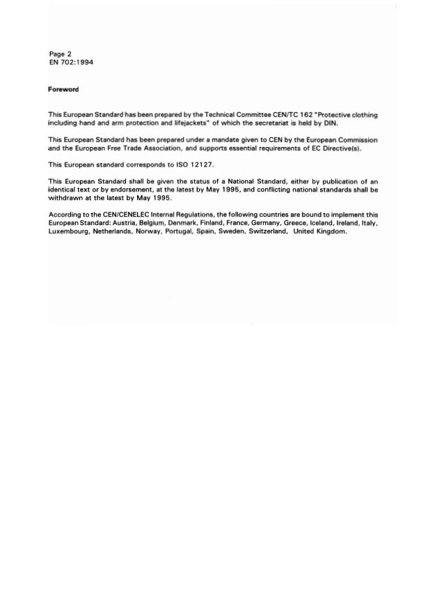 EN 702:1994 is associated with the following European legislation: EU Directives/Regulations: 89/686/EEC; Standardization Mandates: M/BC/CEN/88/10. When a standard is cited in the Official Journal of the European Union, products manufactured in conformity with it benefit from a presumption of conformity with the essential requirements of the corresponding EU directive or regulation.