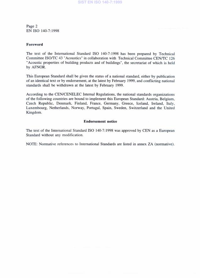 EN ISO 140-7:1998 is a standard published by the European Committee for Standardization (CEN). Its full title is "Acoustics - Measurement of sound insulation in buildings and of building elements - Part 7: Field measurements of impact sound insulation of floors (ISO 140-7:1998)". This standard covers: Migrated from Progress Sheet (TC Comment) (2000-07-10): EN ISO 140-1 and -3 to -8 are a package and have as DOW 1997-06-30 (BTS1 17/94) ++ DOW for EN ISO 140-1, -3 to -8 will be 1998-12-31 (2nd ext. - BTS1 C 16/1997) ++ SPP update 1997-12-11