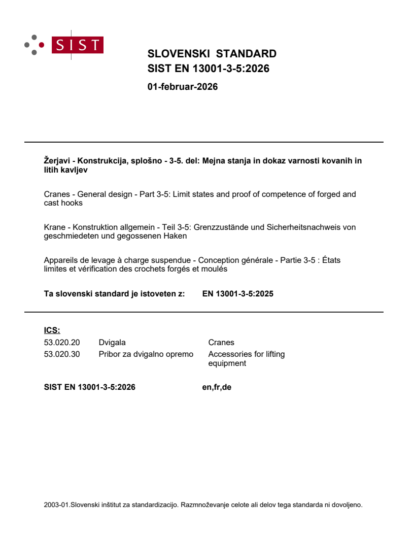 EN 13001-3-5:2025 is a standard published by the European Committee for Standardization (CEN). Its full title is "Cranes - General design - Part 3-5: Limit states and proof of competence of forged and cast hooks". This standard covers: This document covers shank hooks made of steel forgings or steel castings, including stainless steel, with shanks machined for a thread/nut suspension of the hook. Plate hooks, which are those, assembled of one or several parallel parts of rolled steel plates, are not covered by this document. The significant hazardous situations and hazardous events that could result in risks to persons during intended use and reasonably foreseeable misuse are identified in Annex N. Clauses 4 to 6 of this document provide requirements and methods to reduce or eliminate the risks of exceeding the limits of strength (yield, ultimate, fatigue, brittle fracture) considering temperature limits of material. The hazards covered by this document are identified in Annex N. This document is applicable to hooks installed in cranes manufactured after the date of approval of this European Standard by CEN and serves as a reference base for product standards of particular crane types. This part of EN 13001 deals only with the limit state method in accordance with EN 13001-1:2015.