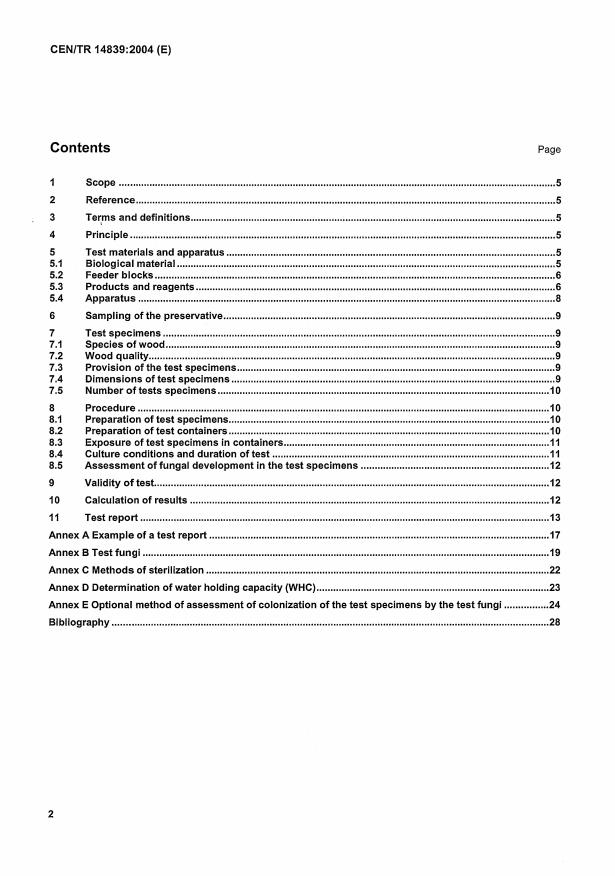 CEN/TR 14839:2004 is a technical report published by the European Committee for Standardization (CEN). Its full title is "Wood preservatives - Determination of the preventive efficacy against wood destroying basidiomycetes fungi". This standard covers: This European prestandard specifies a method of test for the determination of the preventive action of a wood preservative against basidiomycete fungi when the preservative is applied as a surface treatment to wood. This method is applicable to formulations of preservatives in a ready to use form as: water insoluble chemicals which are being studied as active fungicides or; - organic formulations, as supplied or as prepared in the laboratory by dilution of concentrates or; - organic water dispersible formulations as supplied or as prepared in the laboratory by dilution of concentrates ...