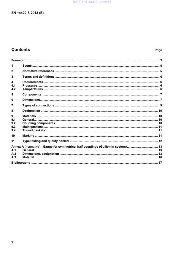 Contents Page Foreword .3 1 Scope .5 2 Normative references .5 3 Terms and definitions .6 4 Requirements .6 4.1 Pressures .6 4.2 Temperatures .6 5 Components .7 6 Dimensions .7 7 Types of connections .9 8 Designation . 10 9 Materials . 10 9.1 General . 10 9.2 Coupling components . 10 9.3 Main gaskets: . 11 9.4 Thread gaskets: . 11 10 Marking . 11 11 Type testing and quality control . 12 Annex A (normative)