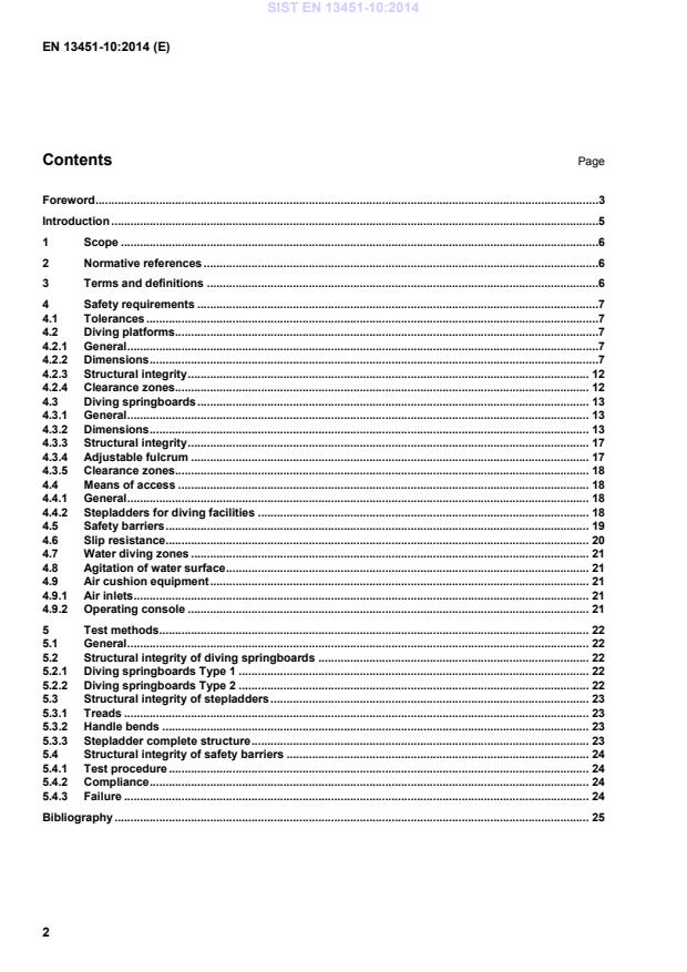 Foreword .3 Introduction .5 1 Scope .6 2 Normative references .6 3 Terms and definitions .6 4 Safety requirements .7 4.1 Tolerances .7 4.2 Diving platforms.7 4.2.1 General .7 4.2.2 Dimensions .7 4.2.3 Structural integrity . 12 4.2.4 Clearance zones. 12 4.3 Diving springboards . 13 4.3.1 General . 13 4.3.2 Dimensions . 13 4.3.3 Structural integrity . 17 4.3.4 Adjustable fulcrum . 17 4.3.5 Clearance zones. 18 4.4 Means of access . 18 4.4.1 General . 18 4.4.2 Stepladders for diving facilities . 18 4.5 Safety barriers . 19 4.6 Slip resistance . 20 4.7 Water diving zones . 21 4.8 Agitation of water surface . 21 4.9 Air cushion equipment . 21 4.9.1 Air inlets . 21 4.9.2 Operating console . 21 5 Test methods . 22 5.1 General . 22 5.2 Structural integrity of diving springboards . 22 5.2.1 Diving springboards Type 1 . 22 5.2.2 Diving springboards Type 2 . 22 5.3 Structural integrity of stepladders . 23 5.3.1 Treads . 23 5.3.2 Handle bends . 23 5.3.3 Stepladder complete structure . 23 5.4 Structural integrity of safety barriers . 24 5.4.1 Test procedure . 24 5.4.2 Compliance . 24 5.4.3 Failure . 24 Bibliography . 25