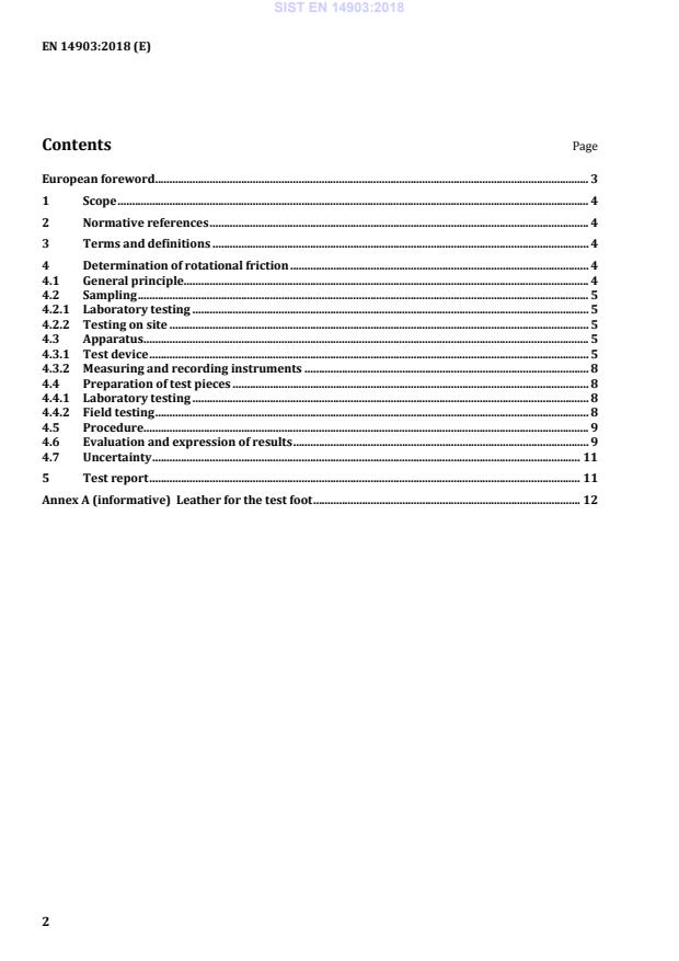 Ta evropski standard določa metodo za ugotavljanje trenja med poljubno športno površino in vrtečo se nogo pri vertikalni obremenitvi. Metoda se uporablja za preskušanja v laboratoriju ali na mestu uporabe.