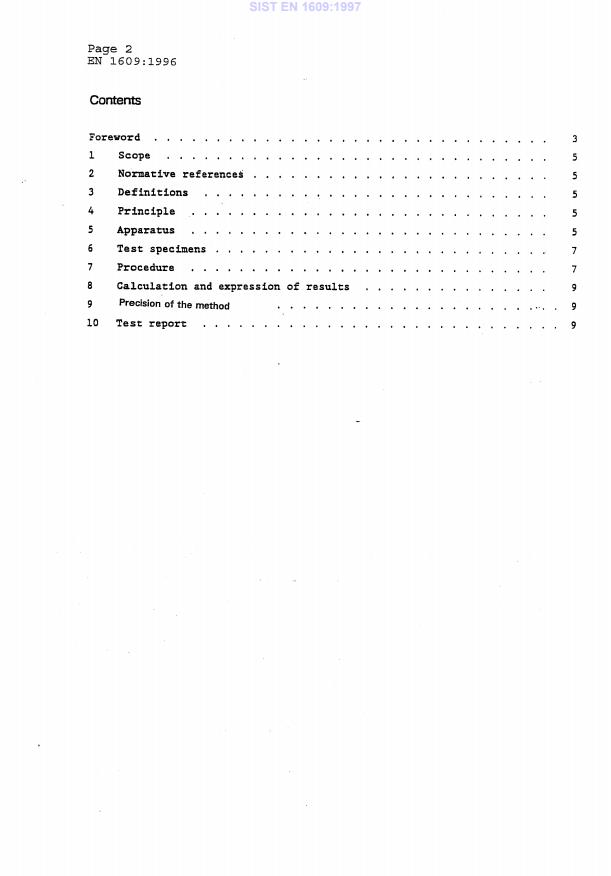 EN 1609:1996 is a standard published by the European Committee for Standardization (CEN). Its full title is "Thermal insulating products for building applications - Determination of short term water absorption by partial immersion". This standard covers: This European standard specifies the equipment and procedures for determining the short term water absorption of test specimens by partial immersion. It is applicable to thermal insulating products. NOTE: it is intended to simulate the water absorption caused by a 24 h raining period during construction work.