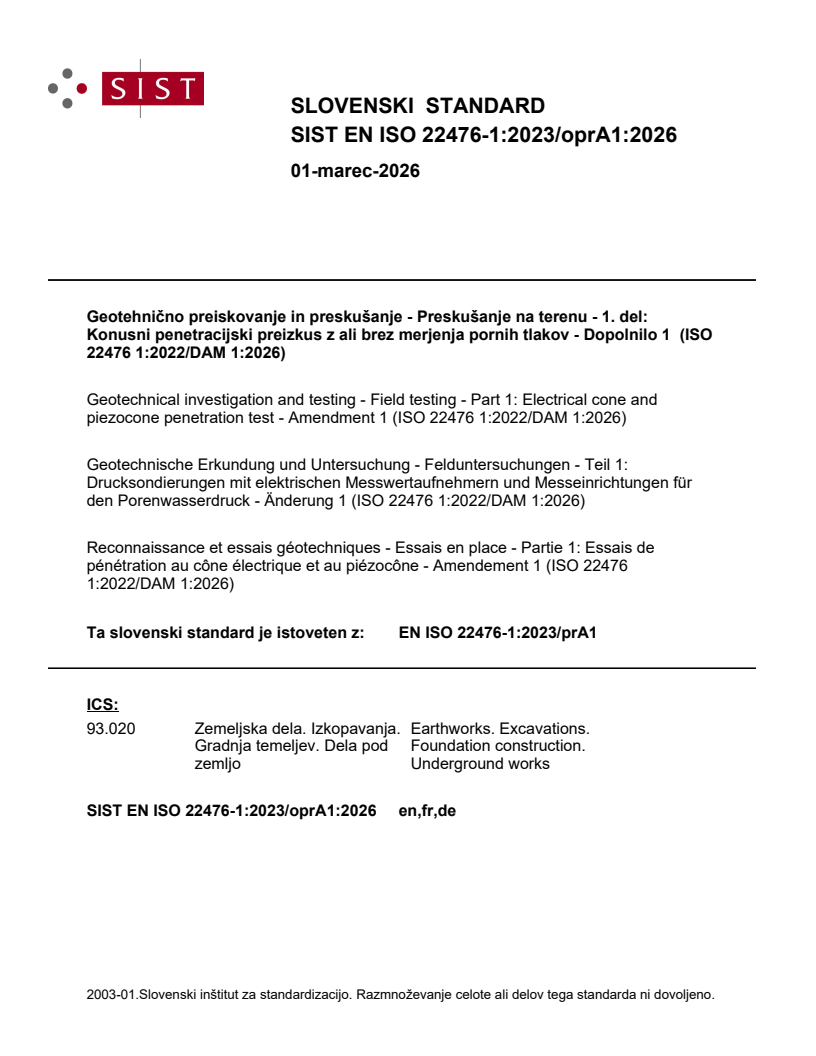 Geotehnično preiskovanje in preskušanje - Preskušanje na terenu - 1. del: Konusni penetracijski preizkus z ali brez merjenja pornih tlakov - Dopolnilo 1 (ISO 22476 1:2022/DAM 1:2026)