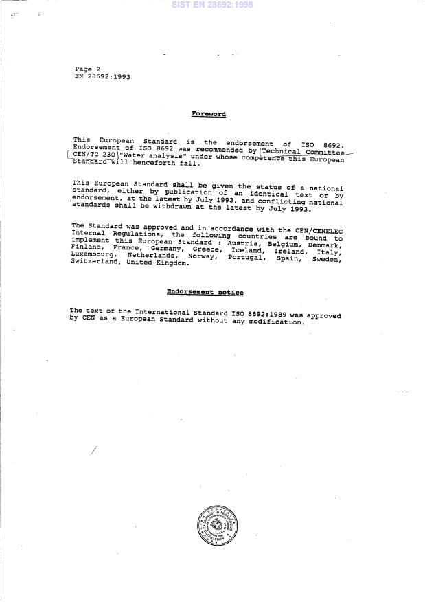 Is0 8692 : 1989 (El Foreword IS0 (the International Organization for Standardization) is a worldwide federation of national standards bodies (IS0 member bodies). The work of preparing International Standards is normally carried out through IS0 technical committees. Each member body interested in a subject for which a technical committee has been established has the right to be represented on that committee. International organizations, govern- mental and non-governmental, in liaison with ISO, also take part in the work. IS0 collaborates closely with the International Electrotechnical Commission (IEC) on all matters of electrotechnical standardization. Draft International Standards adopted by the technical committees are circulated to the member bodies for approval before their acceptance as International Standards by the IS0 Council. They are approved in accordance with IS0 procedures requiring at least 75 % approval by the member bodies voting. International Standard IS0 8692 was prepared by Technical Committee ISO/TC 147, Water quality, Annex A of this International Standard is for information only. 0 IS0 1989 All rights reserved. No part of this publication may be reproduced or utilized in any form or by any means, electronic or mechanical, including photocopying and microfilm, without permission in writing from the publisher. International Orga nization for Standardization Case postale 560 CH-121 1 Geneve 20 l Switzerland Printed in Switzerland SIST EN 28692:1998