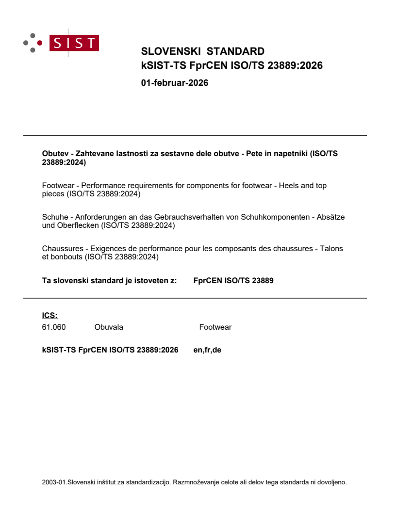 Obutev - Zahtevane lastnosti za sestavne dele obutve - Pete in napetniki (ISO/TS 23889:2024)