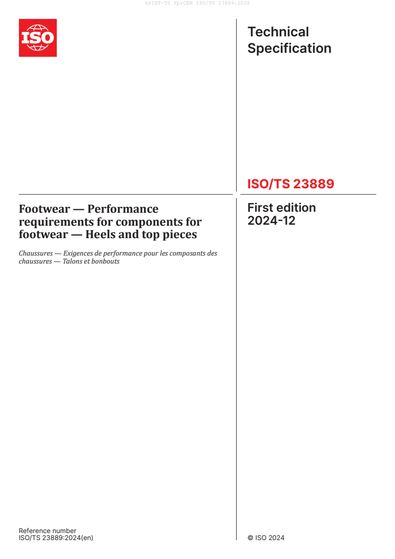CEN ISO/TS 23889:2026 is a draft published by the European Committee for Standardization (CEN). Its full title is "Footwear - Performance requirements for components for footwear - Heels and top pieces (ISO/TS 23889:2024)". This standard covers: This document establishes the performance requirements for heel and top pieces components for footwear, irrespective of the material, in order to assess the suitability for the end use and/or fitness for purpose. It also establishes the test methods used to evaluate the compliance with the requirements. This document applies to heel and top piece for all kind of footwear as defined in Clause 4. It does not apply to finished footwear. This document can be used as a reference by the manufacturer and the supplier