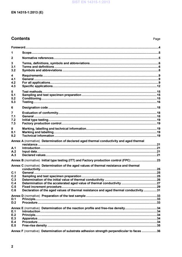 - Testing procedures - methods and sample preparation for determining key properties (see normative annexes for procedures such as determination of aged thermal conductivity, free‑rise density, substrate adhesion, and reaction to fire).
