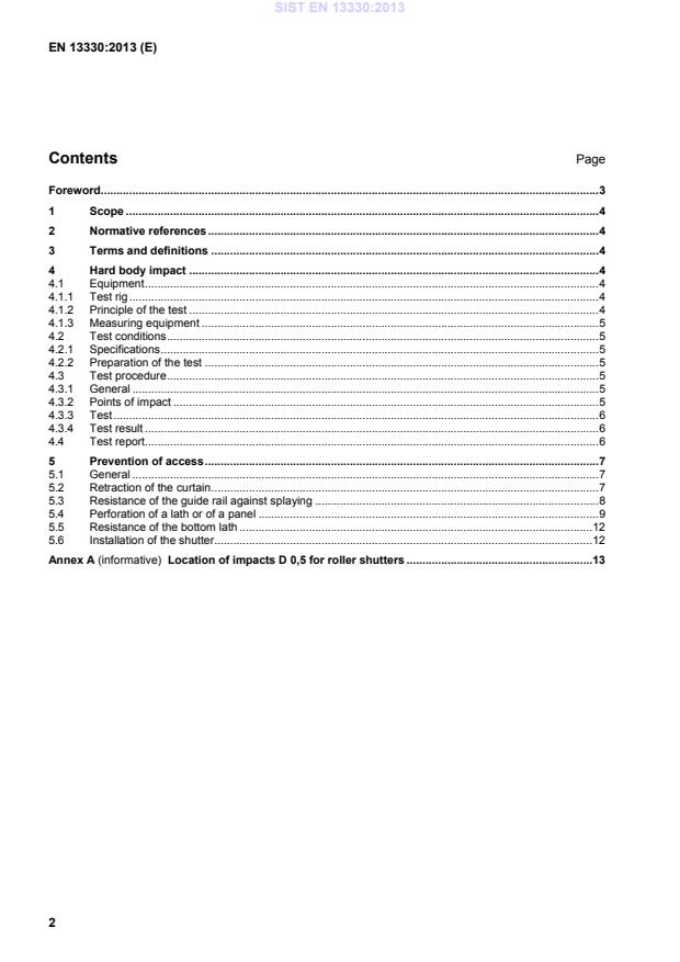 Page Foreword . 3 1 Scope . 4 2 Normative references . 4 3 Terms and definitions . 4 4 Hard body impact . 4 4.1 Equipment . 4 4.1.1 Test rig . 4 4.1.2 Principle of the test . 4 4.1.3 Measuring equipment . 5 4.2 Test conditions . 5 4.2.1 Specifications . 5 4.2.2 Preparation of the test . 5 4.3 Test procedure . 5 4.3.1 General . 5 4.3.2 Points of impact . 5 4.3.3 Test . 6 4.3.4 Test result . 6 4.4 Test report. 6 5 Prevention of access . 7 5.1 General . 7 5.2 Retraction of the curtain . 7 5.3 Resistance of the guide rail against splaying . 8 5.4 Perforation of a lath or of a panel . 9 5.5 Resistance of the bottom lath . 12 5.6 Installation of the shutter . 12 Annex A (informative)