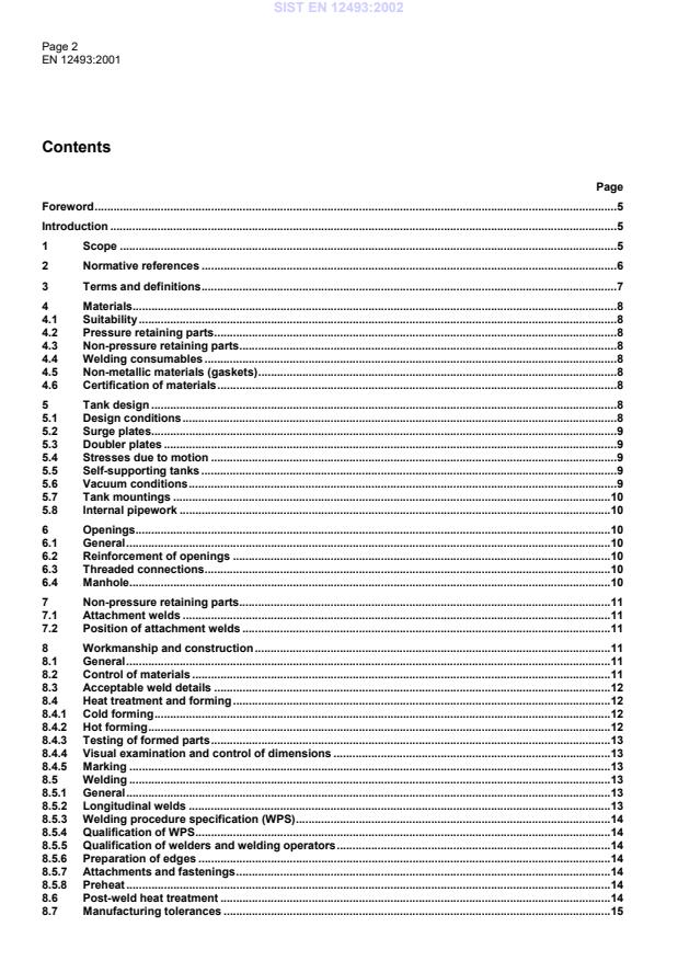 Page 2EN 12493:2001ContentsPageForeword.5Introduction.51Scope.52Normative references.63Terms and definitions.74Materials.84.1Suitability.84.2Pressure retaining parts.84.3Non-pressure retaining parts.84.4Welding consumables.84.5Non-metallic materials (gaskets).84.6Certification of materials.85Tank design.85.1Design conditions.85.2Surge plates.95.3Doubler plates.95.4Stresses due to motion.95.5Self-supporting tanks.95.6Vacuum conditions.95.7Tank mountings.105.8Internal pipework.106Openings.106.1General.106.2Reinforcement of openings.106.3Threaded connections.106.4Manhole.107Non-pressure retaining parts.117.1Attachment welds.117.2Position of attachment welds.118Workmanship and construction.118.1General.118.2Control of materials.118.3Acceptable weld details.128.4Heat treatment and forming.128.4.1Cold forming.128.4.2Hot forming.128.4.3Testing of formed parts.138.4.4Visual examination and control of dimensions.138.4.5Marking.138.5Welding.138.5.1General.138.5.2Longitudinal welds.138.5.3Welding procedure specification (WPS).148.5.4Qualification of WPS.148.5.5Qualification of welders and welding operators.148.5.6Preparation of edges.148.5.7Attachments and fastenings.148.5.8Preheat.148.6Post-weld heat treatment.148.7Manufacturing tolerances.15SIST EN 12493:2002