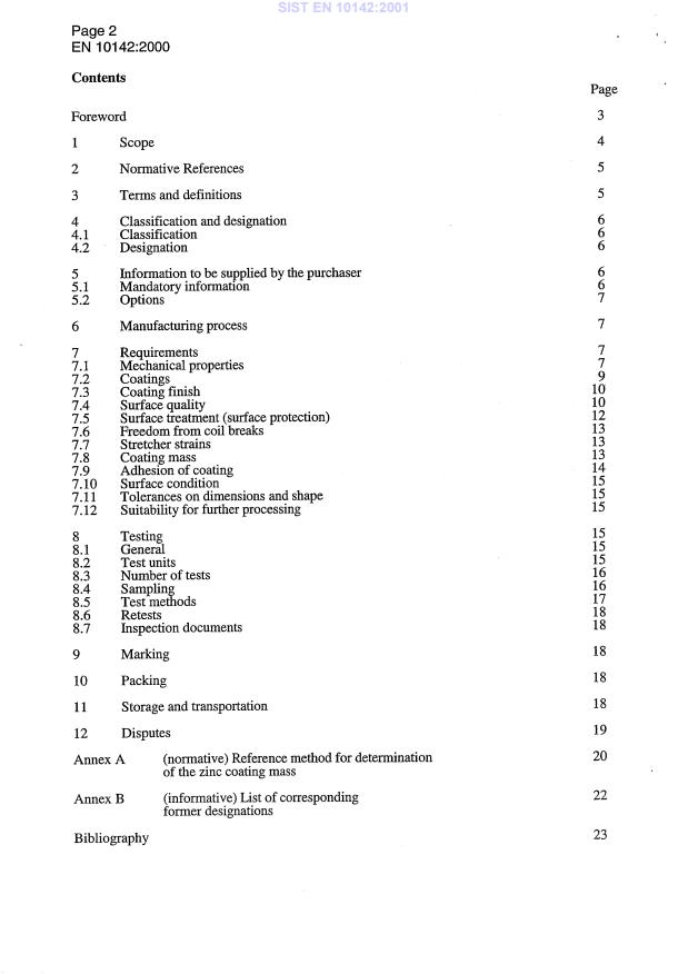 EN 10142:2000 is a standard published by the European Committee for Standardization (CEN). Its full title is "Continuously hot-dip zinc coated low carbon steels strip and sheet for cold forming - Technical delivery conditions". This standard covers: 1.1 This European Standard specifies requirements for continuously hot-dip zinc coated flat products in thicknesses up to and including 3,0 mm - unless otherwise agreed at the time of ordering - made of the steel given in 4.1 and Table 1. The thickness is the final thickness of the delivered product after zinc coating. This European Standard applies to strip of all widths and to sheets cut from it (>/- 600 mm width) and cut lengths (< 600 mm width). The types of coating, coating masses and coating finishes available, and surface qualities are given in Tables 2 to 4 (see also 7.2 to 7.4).