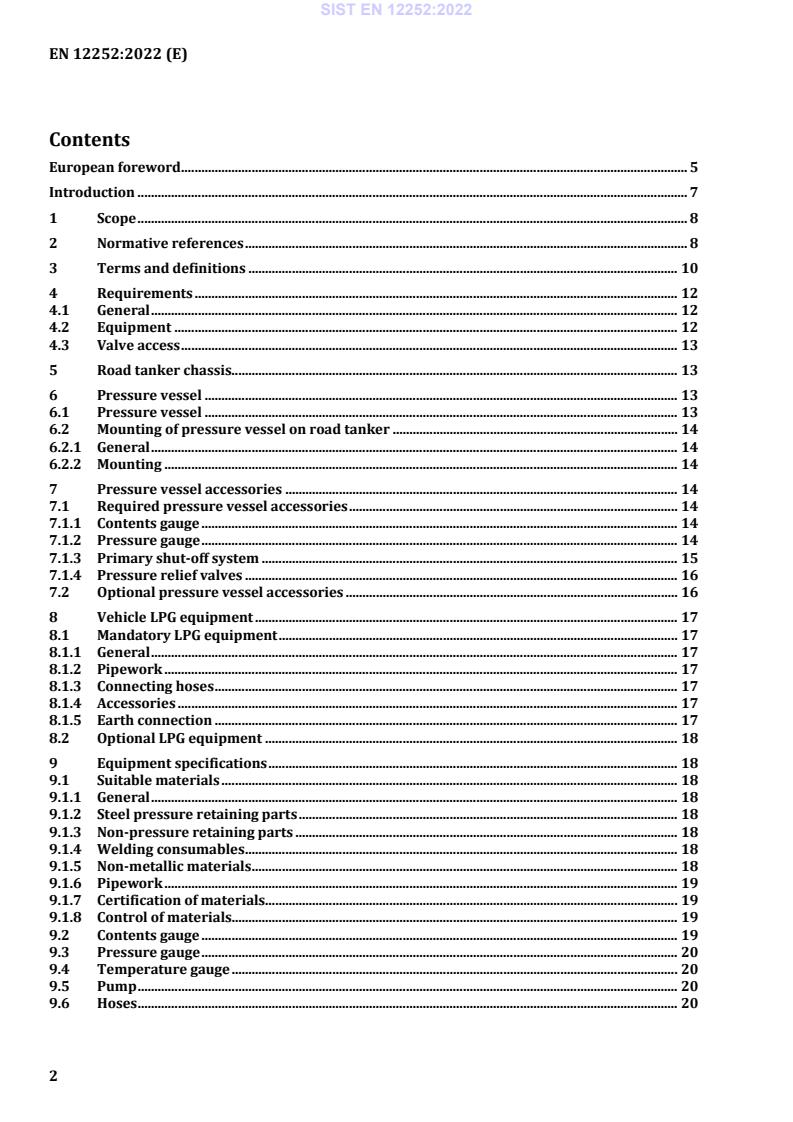 EN 12252:2022 is a standard published by the European Committee for Standardization (CEN). Its full title is "LPG equipment and accessories - Equipping of LPG road tankers". This standard covers: This document specifies equipment and accessories for road tankers used for the transport of Liquefied Petroleum Gas (LPG) and identifies the equipment that is considered necessary to ensure that filling, transportation and discharge operations can be carried out safely. It specifies the requirements for the assembly of the accessories and the vehicle LPG equipment to the road tanker. This document also identifies additional equipment and accessories that can be used on road tankers carrying LPG. This document does not preclude the use of alternative designs, materials and equipment testing which provide the same or a higher level of safety. ADR [9] requires that such alternative technical codes be recognized by the competent authority, provided that the minimum requirements of section 6.8.2 of ADR [9] are complied with. This document does not apply to “tank-containers” or “battery-vehicles” used for the transport of LPG.