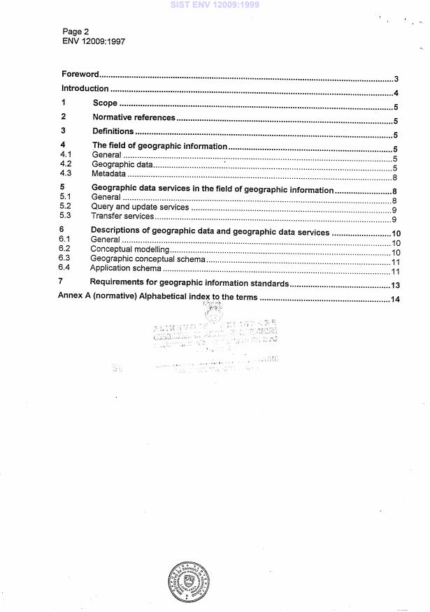 ENV 12009:1997 is a standardization document published by the European Committee for Standardization (CEN). Its full title is "Geographic information - Reference model". This standard covers: This European Prestandard identifies and defines a structured set of concepts and components enabling the definition, the description, the structuring, the query and the updates and the transfer of geographic information and information about geographic information. This European Prestandard does not prescribe the use of any specific standard, it does not serve as an implementation specification for systems nor does it serve as a basis for appraising the conformance of implementations.