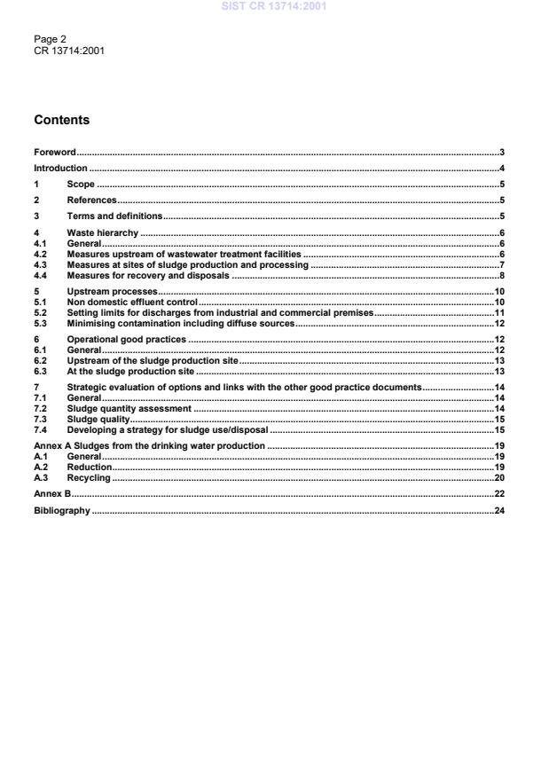 CR 13714:2001 is a standardization document published by the European Committee for Standardization (CEN). Its full title is "Characterisation of sludges - Sludge management in relation to use or disposal". This standard covers: This CEN report gives guidance for dealing with the production and control of sludge in relation to inputs and treatment and give a strategic evaluation of recovery and disposal options for sludge according to its properties and the availability of outlets. This report is applicable for following sludges : - storm water handling ; - night soil ; - urban wastewater collecting systems ; - urban wastewater treatment plants ; - treating industrial wastewater similar to urban wastewater (as defined in Directive 91/271/EC) ; but excluding hazardous sludges from industry. Annex A gives information on sludges from water supply.