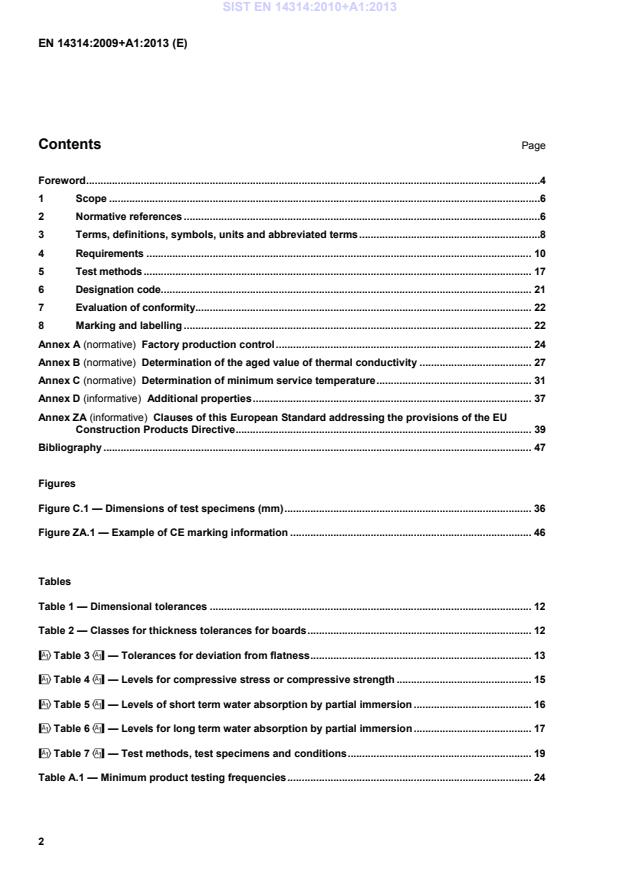 Tables Table 1 — Dimensional tolerances . 12 Table 2 — Classes for thickness tolerances for boards . 12 !Table 3" — Tolerances for deviation from flatness . 13 !Table 4" — Levels for compressive stress or compressive strength . 15 !Table 5" — Levels of short term water absorption by partial immersion . 16 !Table 6" — Levels for long term water absorption by partial immersion . 17 !Table 7" — Test methods, test specimens and conditions . 19 Table A.1 — Minimum product testing frequencies . 24 SIST EN 14314:2010+A1:2013