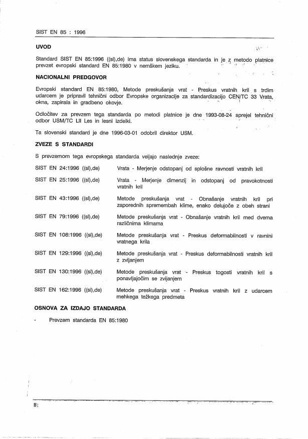 EN 85:1980 is a standard + national annex and/or foreword published by the European Committee for Standardization (CEN). Its full title is "Methods of testing doors - Hard body impact test on door leaves". This standard covers: Methods of testing doors - Hard body impact test on door leaves