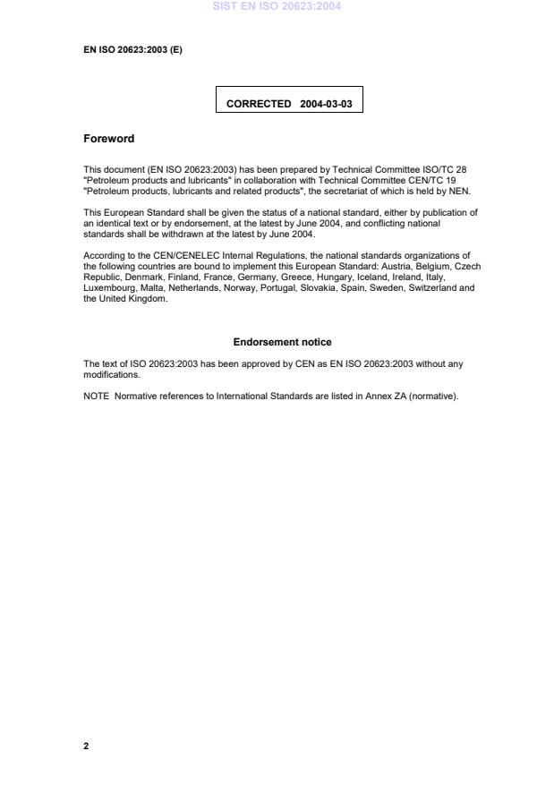2004-03-03ForewordThis document (EN ISO 20623:2003) has been prepared by Technical Committee ISO/TC 28"Petroleum products and lubricants" in collaboration with Technical Committee CEN/TC 19"Petroleum products, lubricants and related products", the secretariat of which is held by NEN.This European Standard shall be given the status of a national standard, either by publication ofan identical text or by endorsement, at the latest by June 2004, and conflicting nationalstandards shall be withdrawn at the latest by June 2004.According to the CEN/CENELEC Internal Regulations, the national standards organizations ofthe following countries are bound to implement this European Standard: Austria, Belgium, CzechRepublic, Denmark, Finland, France, Germany, Greece, Hungary, Iceland, Ireland, Italy,Luxembourg, Malta, Netherlands, Norway, Portugal, Slovakia, Spain, Sweden, Switzerland andthe United Kingdom.Endorsement noticeThe text of ISO 20623:2003 has been approved by CEN as EN ISO 20623:2003 without anymodifications.NOTE