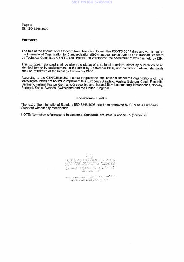 EN ISO 3248:2000 is a standard published by the European Committee for Standardization (CEN). Its full title is "Paints and varnishes - Determination of the effect of heat (ISO 3248:1998)". This standard covers: This standard specifies a general procedure for determining the resistance of single coatings or multicoat systems of paints or related products to the effect of heat.
