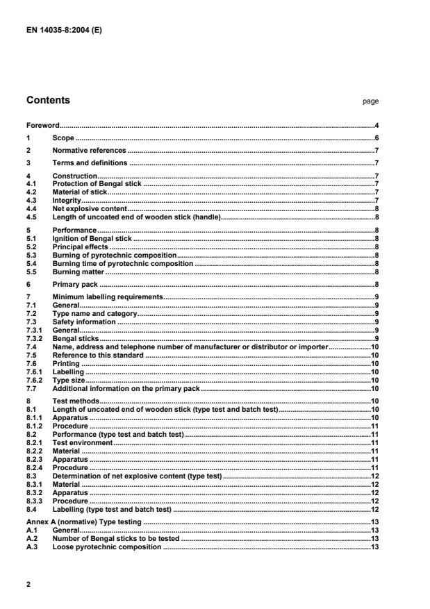 EN 14035-8:2004 is a standard published by the European Committee for Standardization (CEN). Its full title is "Fireworks - Part 8: Bengal sticks - Specification and test methods". This standard covers: This document specifies requirements for the construction, performance, primary packaging and labelling of Bengal sticks and the corresponding test methods. It is applicable to fireworks which are classified as Bengal sticks in categories 1 and 2 in EN 14035-2 and which are contained in a primary pack. It is not applicable to Bengal sticks containing pyrotechnic composition that includes any of the following substances: - arsenic or arsenic compounds; - mixtures containing a mass fraction of chlorates greater than 80 %; - mixtures of chlorates with metals; - mixtures of chlorates with red phosphorus; - mixtures of chlorates with potassium hexacyanoferrate(II); - mixtures of chlorates with sulfur; - mixtures of chlorates with sulfides; - lead or lead compounds; - mercury compounds; - white phosphorus; - picrates or picric acid; - potassium chlorate with a mass fraction of bromates greater than 0,15 %; - sulfur with an acidity, expressed in mass fraction of sulphuric acid, greater than 0,002 %; - zirconium with a particle size of less than 40 mm. NOTE In EN 14035-2, Bengal sticks are classified as follows: - brief description: wooden stick partially coated (along one end) with slow-burning pyrotechnic composition and designed to be held in the hand; - principal effects: emission of coloured flames and sparks. Schemes for type testing of Bengal sticks and batch testing of Bengal sticks are specified in annex A and annex B respectively. Requirements for construction, performance, labelling, sampling and testing of Bengal sticks