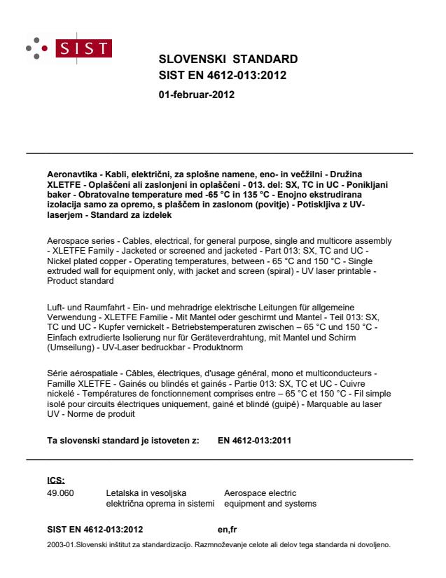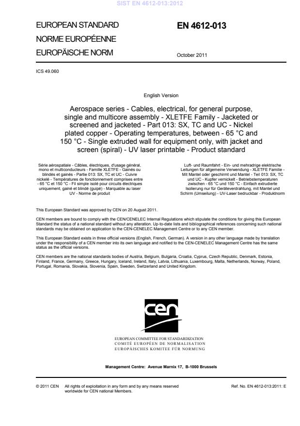 2003-01.Slovenski inštitut za standardizacijo. Razmnoževanje celote ali delov tega standarda ni dovoljeno.WUXGLUDQDLuft- und Raumfahrt - Ein- und mehradrige elektrische Leitungen für allgemeine Verwendung - XLETFE Familie - Mit Mantel oder geschirmt und Mantel - Teil 013: SX, TC und UC - Kupfer vernickelt - Betriebstemperaturen zwischen – 65 °C und 150 °C - Einfach extrudierte Isolierung nur für Geräteverdrahtung, mit Mantel und Schirm (Umseilung) - UV-Laser bedruckbar - ProduktnormSérie aérospatiale - Câbles, électriques, d'usage général, mono et multiconducteurs - Famille XLETFE - Gainés ou blindés et gainés - Partie 013: SX, TC et UC - Cuivre nickelé - Températures de fonctionnement comprises entre – 65 °C et 150 °C - Fil simple isolé pour circuits électriques uniquement, gainé et blindé (guipé) - Marquable au laser UV - Norme de produitAerospace series - Cables, electrical, for general purpose, single and multicore assembly - XLETFE Family - Jacketed or screened and jacketed - Part 013: SX, TC and UC - Nickel plated copper - Operating temperatures, between - 65 °C and 150 °C - Single extruded wall for equipment only, with jacket and screen (spiral) - UV laser printable - Product standard49.060Aerospace electric equipment and systemsICS:Ta slovenski standard je istoveten z:EN 4612-013:2011SIST EN 4612-013:2012en,fr01-februar-2012SIST EN 4612-013:2012SLOVENSKI