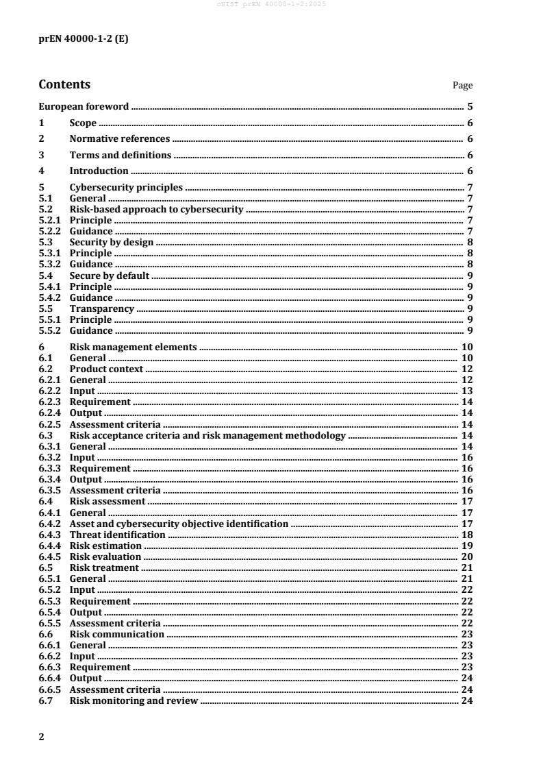 The prEN 40000-1-2 standard, issued by CEN, defines cybersecurity requirements for products with digital elements, focusing specifically on the principles for cyber resilience. This standard applies to all digital products and outlines general cybersecurity principles and risk management activities to be integrated throughout the product lifecycle. Its goal is to ensure and maintain an appropriate level of cybersecurity by addressing risks from design to decommissioning.