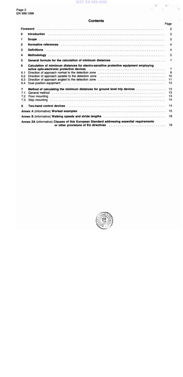 EN 999:1998 is a standard published by the European Committee for Standardization (CEN). Its full title is "Safety of machinery - The positioning of protective equipment in respect of approach speeds of parts of the human body". This standard covers: This European Standard provides parameters based on values for hand/arm and approach speeds and the methodology to determine the minimum distances from specific sensing or actuating devices of protective equipment to a danger zone. These specific devices are: - trip devices as defined in 3.23.5 of EN 292-1:1991 (specifically electro-sensitive protective equipment, pressure sensitive mats), including those used additionally to initiate operation;...