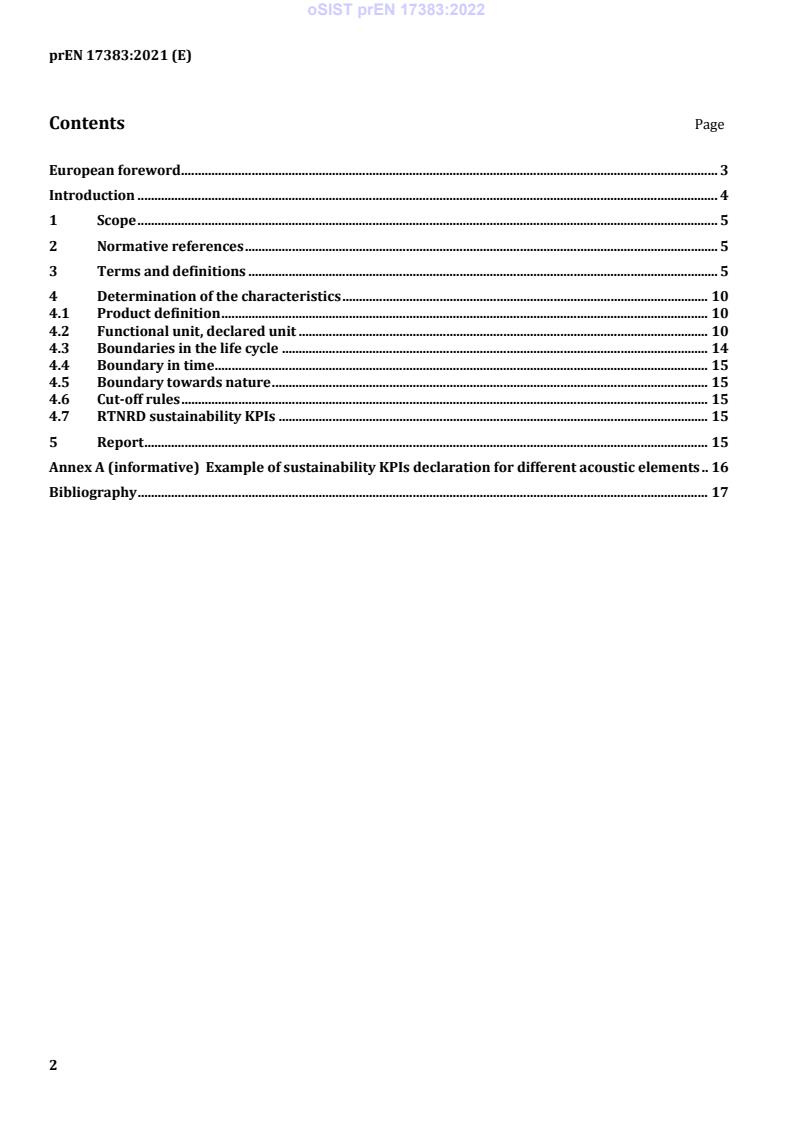 prEN 17383 is a draft published by the European Committee for Standardization (CEN). Its full title is "Road traffic noise reducing devices - Sustainability : Key Sustainability Performance Indicators (KSPI) Declaration". This standard covers: This European Standard specifies the Key Performance Indicators (KPIs) to facilitate a tangible appreciation of the degree by which an NRD can be considered sustainable. It focuses on four key sustainability sets of factors; (i) technical, (ii) environmental, (iii) economic (iv) and social. NRD manufacturers are required to declare the data available against a series of defined measurable quantities that will be used for the evaluation of the sustainability KPIs.