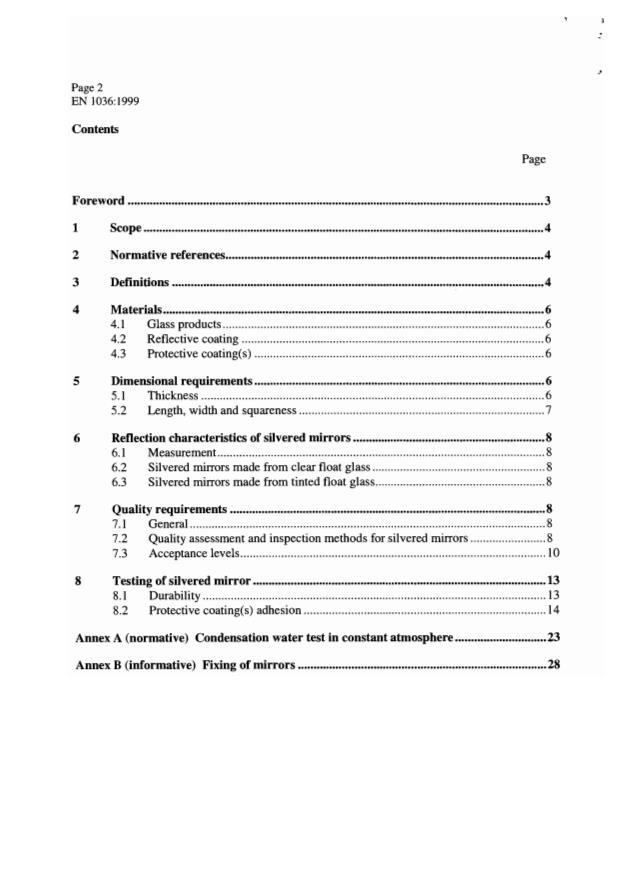 EN 1036:1999 is a standard published by the European Committee for Standardization (CEN). Its full title is "Glass in building - Mirrors from silver-coated float glass for internal use". This standard covers: This European Standard specifies minimum quality requirements (in respect of optical, visual and edge faults) and durability test for mirrors from silvered float glass, for internal use in building.