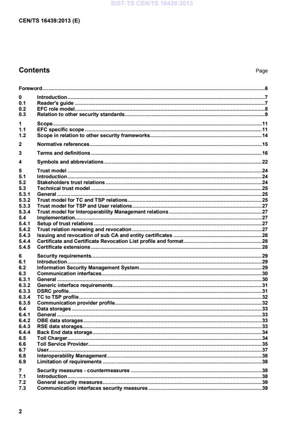 1.1 EFC specific scope ISO 17573 defines the roles and functions as well as the internal and external entities of the EFC system environment. Based on the system architecture defined in ISO 17573, the security framework describes a set of requirements and security measures for stakeholders to implement and operate their part of an EFC system as required for a trustworthy environment according to its basic information security policy. In general, the overall scope is an information security framework for all organisational and technical entities and in detail for the interfaces between them. Figure 3 below illustrates the abstract EFC system model used to analyse the threats, define the security requirements and security measures of this Technical Specification. This Technical Specification is based on the assumption of an OBE which is dedicated to EFC purposes only and neither considers value added services based on EFC OBE, nor more generic OBE platforms (called in-vehicle ITS Stations) used to host the EFC application. The scope of this security framework comprises the following: - general information security objectives of the stakeholders; - threat analysis; - definition of a trust model; - security requirements; - security measures – countermeasures; - security specifications for interface implementation; - key management; - security policies; - privacy-enabled implementations. The following is outside the scope of this Technical Specification: - a complete risk assessment for an EFC system; - security issues rising from an EFC application running on an ITS station; NOTE Security issues associated with an EFC application running on an ITS station will be covered in a CEN Technical Report on "Guidelines for EFC-applications based on in vehicle ITS Stations" that is being developed at the time of publication of this document. - entities and interfaces of the interoperability management role; - the technical trust relation of the model between TSP and User; - a complete specification and description of all necessary security measures to all identified threats; - concrete implementation specifications for implementation of security for EFC system, e.g. European electronic toll service (EETS); - detailed specifications required for privacy-friendly EFC implementations. The detailed scope of the bullet points and the clause with the corresponding content is given below: - General information security objectives of the stakeholders (informative, Annex C) To derive actual security requirements and define implementations, it is crucial to gain a common understanding of the possible different perspectives and objectives of such stakeholders of a toll charging environment. - Threat analysis (informative, Annex D) The threat analysis is the basis and motivation for all the security requirements resulting in this framework. The results from two complementary approaches will be combined in one common set of requirements. The first approach considers a number of threat scenarios from the perspective of various attackers. The second approach looks in depth on threats against the various identified assets (tangible and intangible entities). - Definition of a trust model (normative, Clause 5) The trust model comprises all basic assumptions and principles for establishing trust between the stakeholders. The trust model forms the basis for the implementation of cryptographic procedures to ensure confidentiality, integrity, authenticity and partly non-repudiation of exchanged data. - Security requirements (normative, Clause 6) (...)