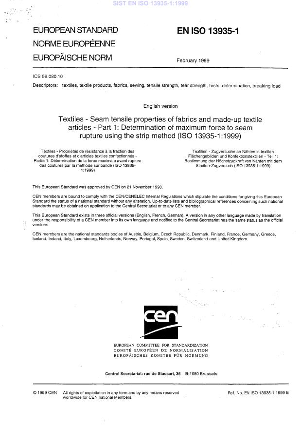 EN ISO 13935-1:1999 is a standard published by the European Committee for Standardization (CEN). Its full title is "Textiles - Seam tensile properties of fabrics and made-up textile articles - Part 1: Determination of maximum force to seam rupture using the strip method (ISO 13935-1:1999)". This standard covers: This part of EN ISO 13935 specifies a procedure to determine the seam maximum force of sewn seams when the force is applied perpendicularly to the seam. This part EN ISO 13935 specifies the method known as the strip test. Note : Part 2 of EN ISO 13935 describes the method known as the grab test. For informative references see annex A.