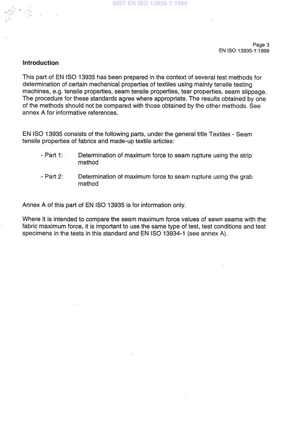 Dieser Teil von EN ISO 13935 legt ein Verfahren fest zur Bestimmung der Höchstzugkraft von Nähten mit dem Streifen-Zugversuch, bei dem die Kraft senkrecht zur Naht wirkt. Anmerkung: In Teil 2 von EN ISO 13935 wird das als Grab-Zugversuch bekannte Verfahren beschrieben. Informative Verweisungen siehe Anhang A.