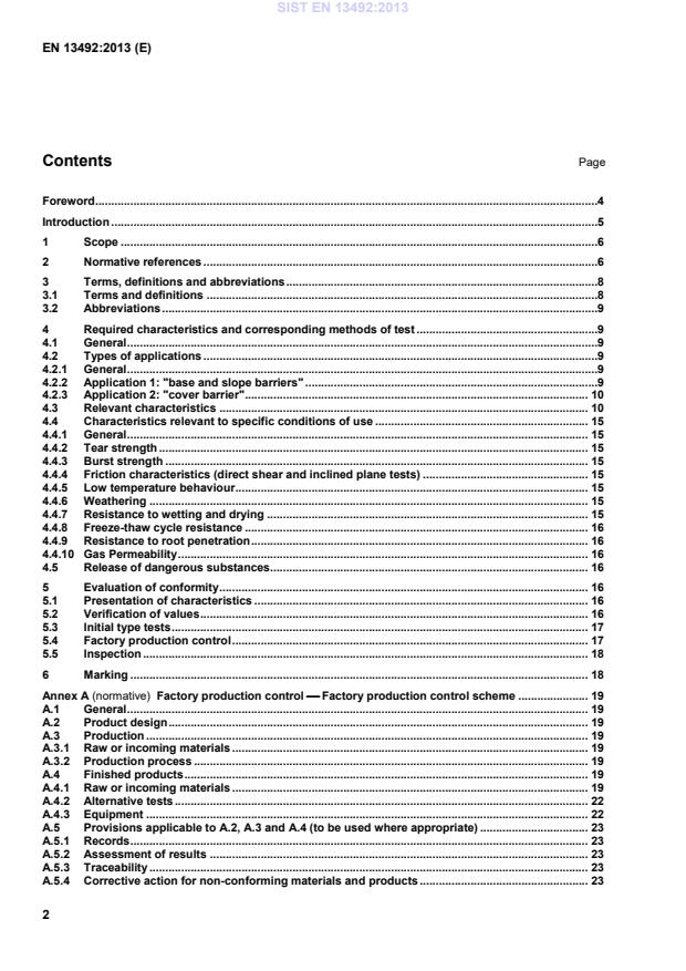 2 Normative references The following documents, in whole or in part, are normatively referenced in this document and are indispensable for its application. For dated references, only the edition cited applies. For undated references, the latest edition of the referenced document (including any amendments) applies. EN 495-5, Flexible sheets for waterproofing — Determination of foldability at low temperature — Part 5: Plastic and rubber sheets for roof waterproofing EN 1109, Flexible sheets for waterproofing — Bitumen sheets for roof waterproofing — Determination of flexibility at low temperature EN 1844, Flexible sheets for waterproofing — Determination of resistance to ozone — Plastic and rubber sheets for roof waterproofing EN 1849-1, Flexible sheets for waterproofing — Determination of thickness and mass per unit area — Part 1: Bitumen sheets for roof waterproofing EN 1849-2, Flexible sheets for waterproofing — Determination of thickness and mass per unit area — Part 2: Plastic and rubber sheets EN 12224, Geotextiles and geotextile-related products — Determination of the resistance to weathering EN 12225, Geotextiles and geotextile-related products — Method for determining the microbiological resistance by a soil burial test EN 12310-1, Flexible sheets for waterproofing — Part 1: Bitumen sheets for waterproofing — Determination of resistance to tearing (nail shank) EN 12311-1, Flexible sheets for waterproofing — Part 1: Bitumen sheets for roof waterproofing — Determination of tensile properties EN 12311-2, Flexible sheets for waterproofing — Determination of tensile properties — Part 2: Plastic and rubber sheets for roof waterproofing EN 13361, Geosynthetic barriers — Characteristics required for use in the construction of reservoirs and dams EN 13362, Geosynthetic Barriers — Characteristics required for use in the construction of canals SIST EN 13492:2013