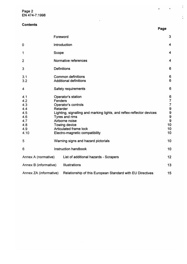 EN 474-7:1998 is a standard published by the European Committee for Standardization (CEN). Its full title is "Earth-moving machinery - Safety - Part 7: Requirements for scrapers". This standard covers: This European Standard specifies additional requirements to and/or exceptions from EN 474-1:1994 "Earth-moving machinery - Safety - Part 1: General requirements". This European Standard applies to wheel and crawler scrapers defined in ISO 6165:1997, and gives additional requirements for derivated machinery. This European Standard deals with all significant hazards pertinent to scrapers when they are used as intended and under the conditions foreseen by the manufacturer (see annex A of this European Standard and annex C of EN 474-1:1994). This European Standard specifies the appropriate technical measures to eliminate or reduce risks arising from the significant hazards.