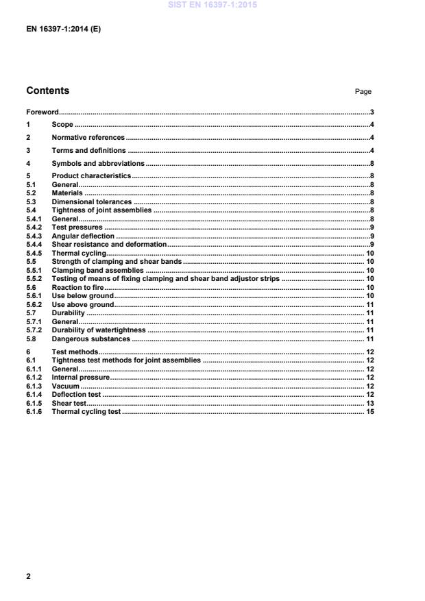 distance between right hand support and load line for FE m Ss distance between seal and support of loaded pipe m 5 Product characteristics 5.1 General Flexible couplings and adaptors and bushes shall meet the product characteristics of this European Standard. When fitted according to the manufacturer's instructions, flexible couplings and adaptors and bushes shall not damage or distort the pipes to which they are connected. Flexible couplings and adaptors and bushes shall be free from such defects as would impair their function when in service. 5.2 Materials All materials used in flexible couplings and adaptors and bushes shall comply with the specific material characteristics in accordance with EN 16397-2. 5.3 Dimensional tolerances NOTE The requirements on tolerances and dimensions are specified in EN 16397-2. 5.4 Tightness of joint assemblies 5.4.1 General Joint assemblies using flexible couplings and adaptors and bushes shall meet the requirements of 5.4.2, 5.4.3, 5.4.4 and 5.4.5. Couplings and adaptors shall be tested in assemblies comprising both rigid pipes, both flexible pipes and a combination of rigid pipes with flexible pipes. When bushes are supplied as part of the product range a minimum of one test per test configuration shall include at least one bush/coupling combination. In addition when subjected to the test specified in the material specific part of this European Standard (EN 16397-2), the maximum sized coupling assembled with the thickest bush supplied and the appropriate pipes from each designated size group and test mode shall be tested at the recommended assembly torque. SIST EN 16397-1:2015