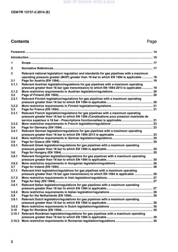 CEN/TR 13737-2:2014 is a technical report published by the European Committee for Standardization (CEN). Its full title is "Gas infrastructure - Implementation Guide for Functional Standards prepared by CEN/TC 234 - Part 2: National Pages related to CEN/TC 234 standards". This standard covers: This Technical Report contains, for each country affected, a national page where the relevant national legislation/regulations for the field of gas infrastructure are listed. The national page can further contain the relevant national standards and/or codes of practice and national bodies which can act as further sources of information, if an interested party needs further guidance. The national page can, if necessary, indicate any requirements in the national legislation/regulations that are more stringent than those in the European Standards prepared by CEN/TC 234. This is done however without giving any details. This does not apply to requirements contained in clauses that are harmonized to any new approach directive. This Technical Report is intended to be a guideline for the national implementation of the functional European Standards elaborated by CEN/TC 234 "Gas infrastructure".